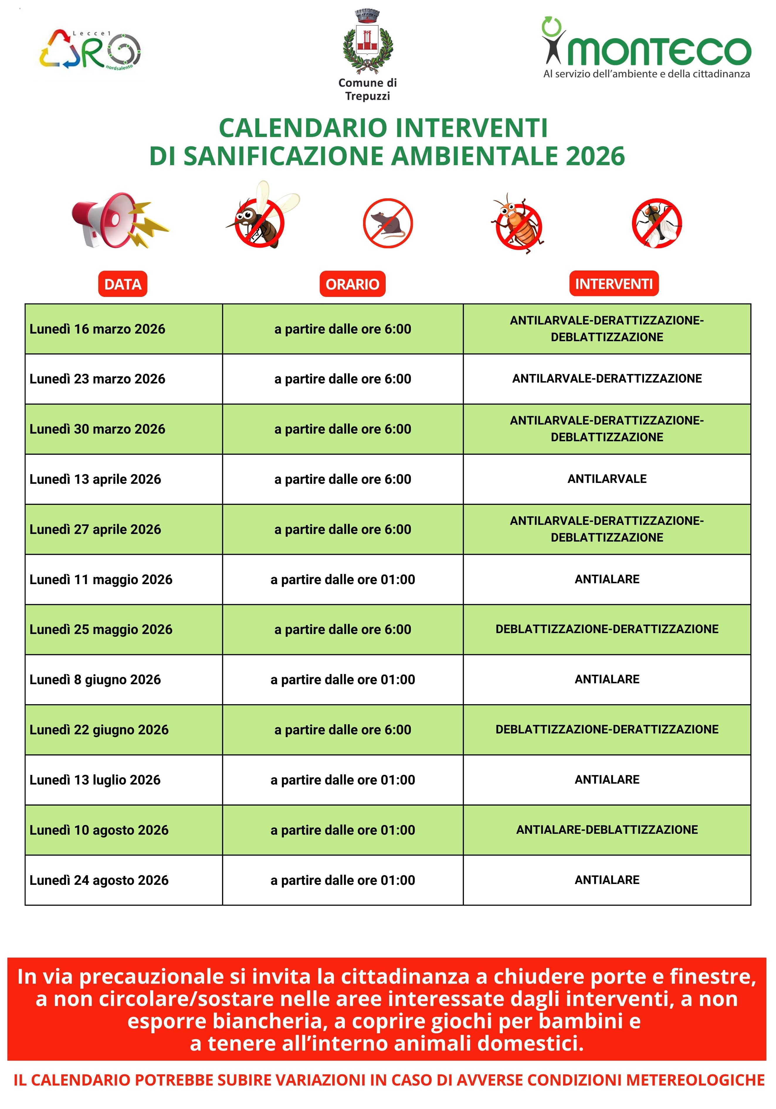 Per le date indicate nel calendario di INTERVENTI DI SANIFICAZIONE AMBIENTALE 2026, si invita tutta la cittadinanza del Comune di Trepuzzi 𝗮 𝗰𝗵𝗶𝘂𝗱𝗲𝗿𝗲 𝗽𝗼𝗿𝘁𝗲 𝗲 𝗳𝗶𝗻𝗲𝘀𝘁𝗿𝗲, 𝗮 𝗻𝗼𝗻 𝗰𝗶𝗿𝗰𝗼𝗹𝗮𝗿𝗲/𝘀𝗼𝘀𝘁𝗮𝗿𝗲 𝗻𝗲𝗹𝗹𝗲 𝗮𝗿𝗲𝗲 𝗶𝗻𝘁𝗲𝗿𝗲𝘀𝘀𝗮𝘁𝗲 𝗱𝗮𝗴𝗹𝗶 𝗶𝗻𝘁𝗲𝗿𝘃𝗲𝗻𝘁𝗶, 𝗮 𝗻𝗼𝗻 𝗲𝘀𝗽𝗼𝗿𝗿𝗲 𝗯𝗶𝗮𝗻𝗰𝗵𝗲𝗿𝗶𝗮, 𝗮 𝗰𝗼𝗽𝗿𝗶𝗿𝗲 𝗴𝗶𝗼𝗰𝗵𝗶 𝗽𝗲𝗿 𝗯𝗮𝗺𝗯𝗶𝗻𝗶 𝗲 𝗮 𝘁𝗲𝗻𝗲𝗿𝗲 𝗮𝗹𝗹'𝗶𝗻𝘁𝗲𝗿𝗻𝗼 𝗮𝗻𝗶𝗺𝗮𝗹𝗶 𝗱𝗼𝗺𝗲𝘀𝘁𝗶𝗰𝗶.