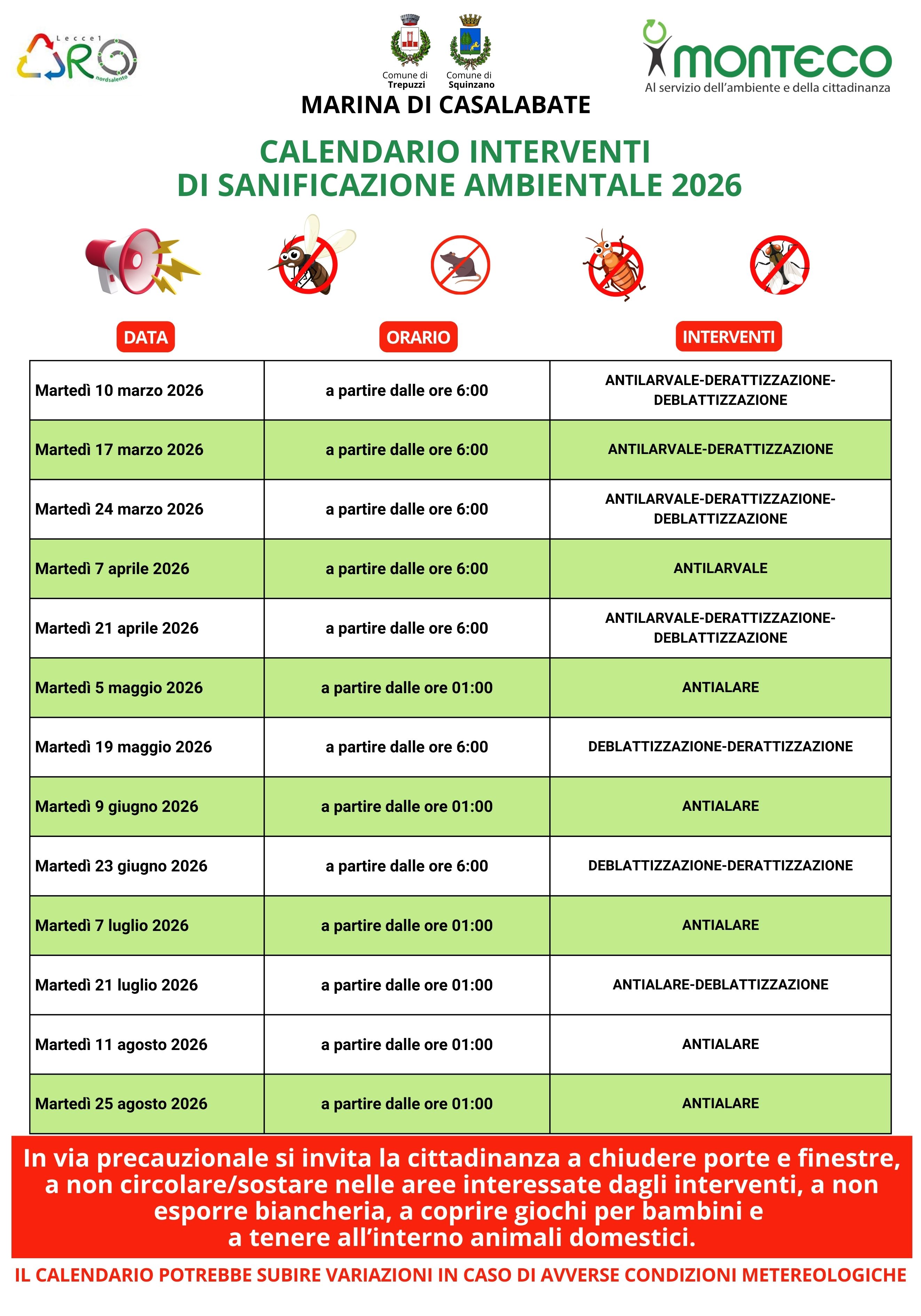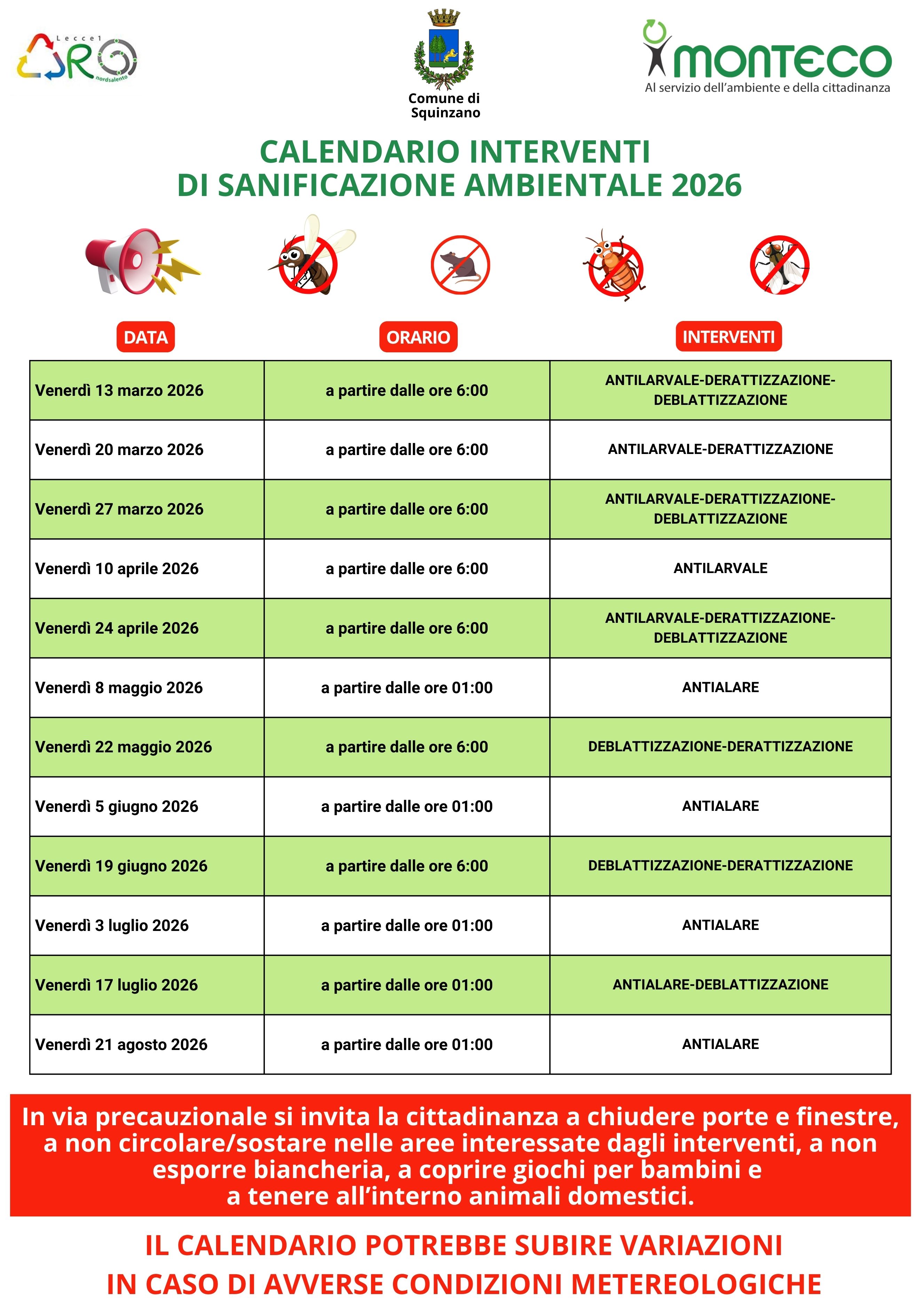 Per le date indicate nel calendario di INTERVENTI DI SANIFICAZIONE AMBIENTALE 2026, si invita tutta la cittadinanza del Comune di Squinzano 𝗮 𝗰𝗵𝗶𝘂𝗱𝗲𝗿𝗲 𝗽𝗼𝗿𝘁𝗲 𝗲 𝗳𝗶𝗻𝗲𝘀𝘁𝗿𝗲, 𝗮 𝗻𝗼𝗻 𝗰𝗶𝗿𝗰𝗼𝗹𝗮𝗿𝗲/𝘀𝗼𝘀𝘁𝗮𝗿𝗲 𝗻𝗲𝗹𝗹𝗲 𝗮𝗿𝗲𝗲 𝗶𝗻𝘁𝗲𝗿𝗲𝘀𝘀𝗮𝘁𝗲 𝗱𝗮𝗴𝗹𝗶 𝗶𝗻𝘁𝗲𝗿𝘃𝗲𝗻𝘁𝗶, 𝗮 𝗻𝗼𝗻 𝗲𝘀𝗽𝗼𝗿𝗿𝗲 𝗯𝗶𝗮𝗻𝗰𝗵𝗲𝗿𝗶𝗮, 𝗮 𝗰𝗼𝗽𝗿𝗶𝗿𝗲 𝗴𝗶𝗼𝗰𝗵𝗶 𝗽𝗲𝗿 𝗯𝗮𝗺𝗯𝗶𝗻𝗶 𝗲 𝗮 𝘁𝗲𝗻𝗲𝗿𝗲 𝗮𝗹𝗹'𝗶𝗻𝘁𝗲𝗿𝗻𝗼 𝗮𝗻𝗶𝗺𝗮𝗹𝗶 𝗱𝗼𝗺𝗲𝘀𝘁𝗶𝗰𝗶.